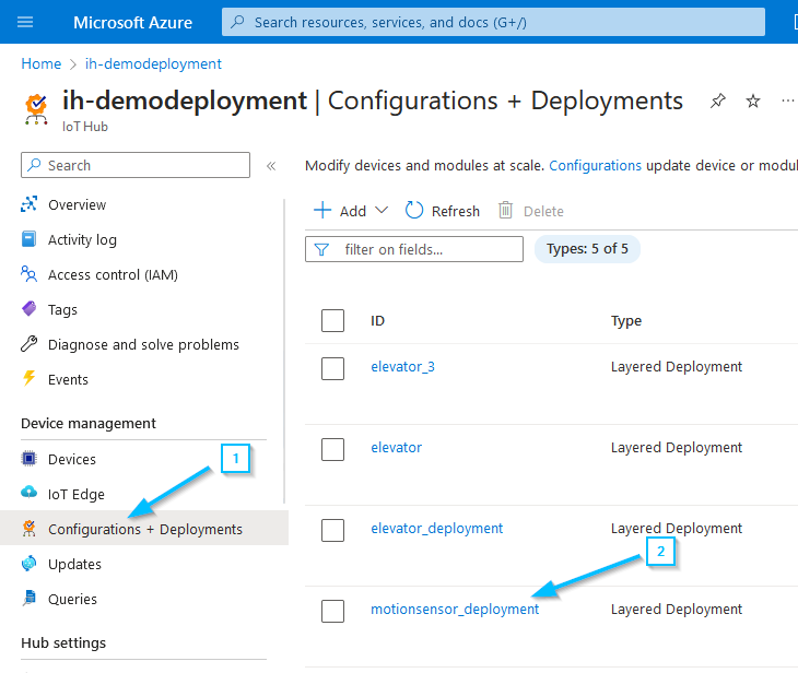 To check if the deployment was successful, I go back to the IoT hub in the Azure portal. In the “Configurations + Deployments” overview, I see the new deployment: