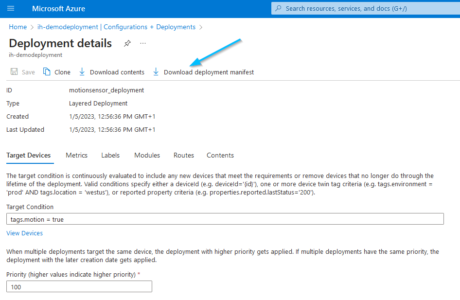 A deployment manifest is mandatory for automatically creating a (layered) deployment. This JSON file describes all the settings like modules, routes and desired properties. Because we have already created a layered deployment in the previous article, we can easily use the deployment manifest of one of those (layered) deployments as base.