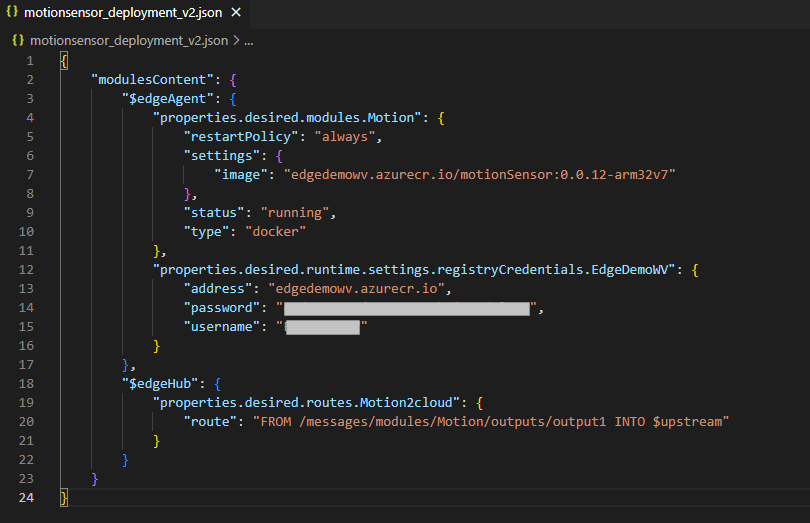 I stored the file in a new VS Code project and renamed the file to motionsensor_deployment_v2.json because I want to deploy a new layered deployment. I added my deployment manifest in the screenshot below.