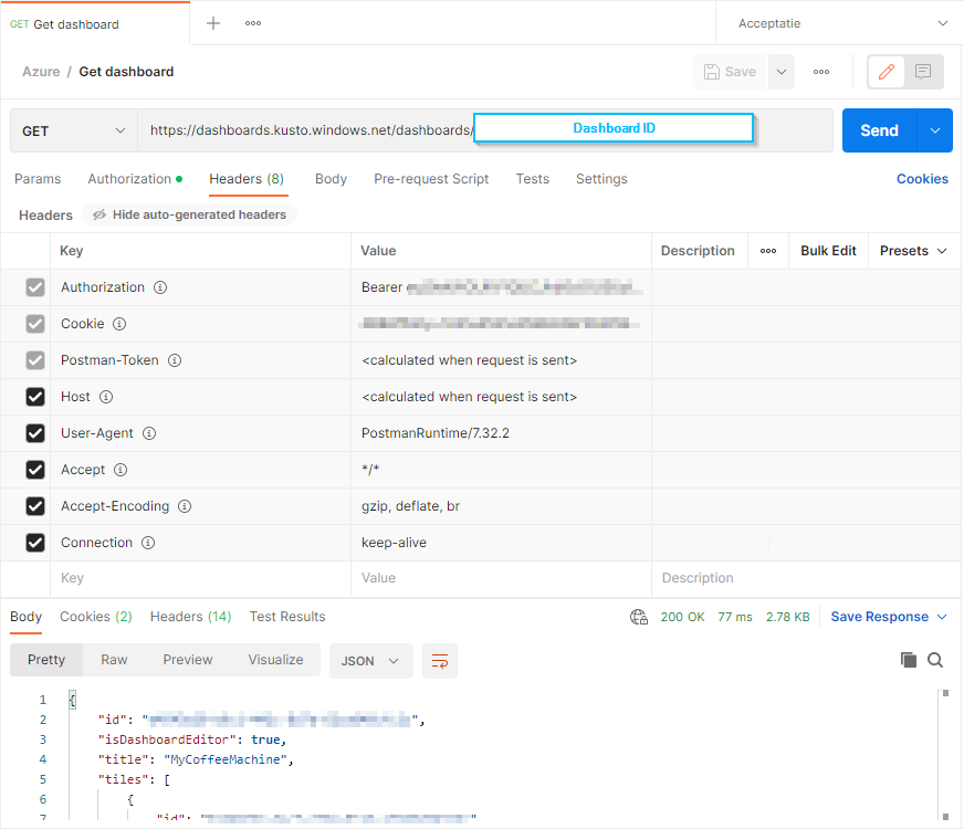 To check if it would work using the Azure DevOps pipeline, I first created a Postman GET request. I started with the basics: a URL and the bearer token. The dashboard ID can be found in the url when you browse to the dashboard in the ADX portal or in the development tool of your browser. The bearer can be found in the development tool in the headers of the request. It would be better to retrieve the bearer token from the Azure API, but for this test, this is enough.