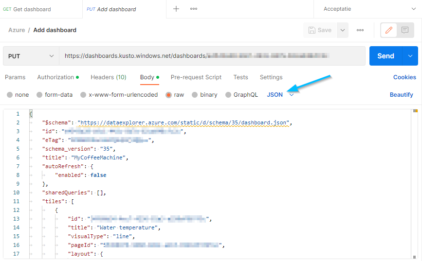 The next step is to send the JSON formatted dashboard back to the API. So I went back to the developer tools of the browser and found out it was a similar request. But in this case, it was a PUT request. So I duplicated the Postman GET request and changed it to a PUT request. To send the dashboard to the API, I added the JSON response of the GET request as the body of this PUT request. In Postman, it is important to change the format of the body to JSON (indicated with the arrow in the screenshot).