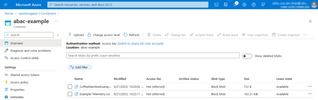 As far as I’ve seen, ABAC is only available for Azure Storage Accounts. So, we start by creating an Azure Storage Account with a Storage container. I created a Storage Account, named “rawstoragewv”, with a container “abac-example”.