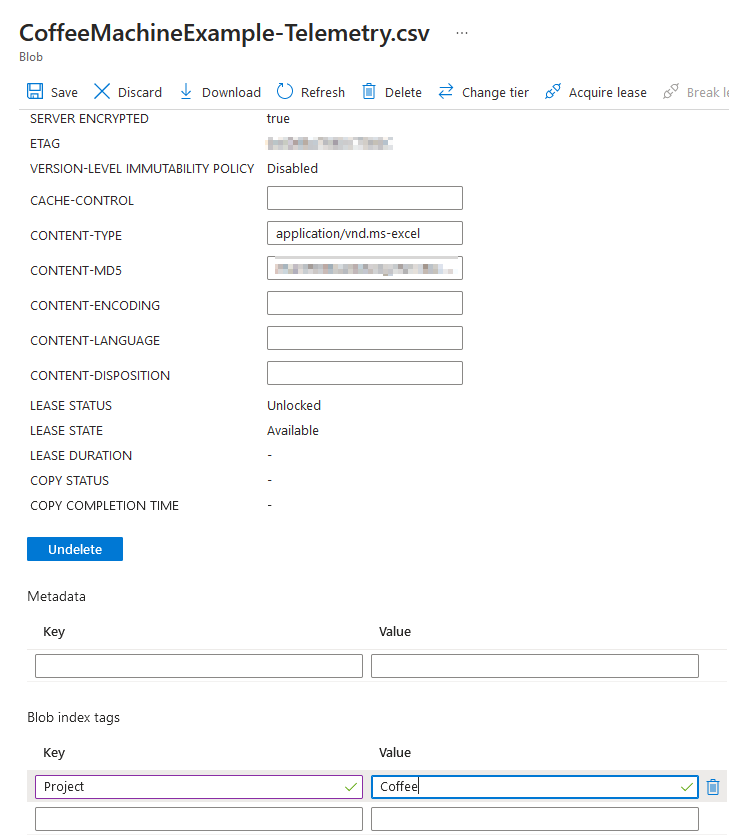 Then, select a file to open the details and scroll down to the Blob index tags. Here, I added a new key/value pair (Project = Coffee):