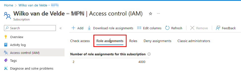 The next step is to add a Role assignment to a Subscription, Resource group or Resource. To do so, I open my subscription and select Access control. When you select Role assignments (see screenshot below) it will display a list of all role assignments created.