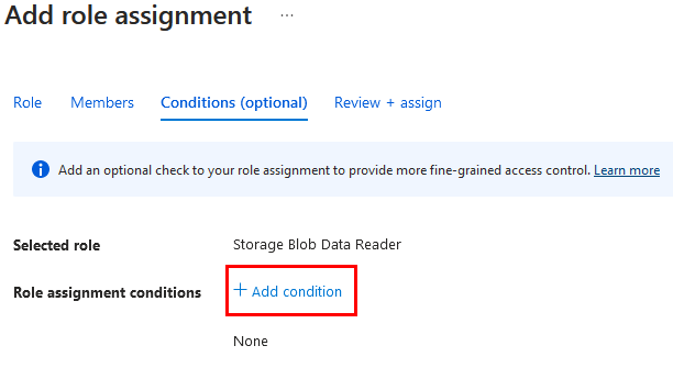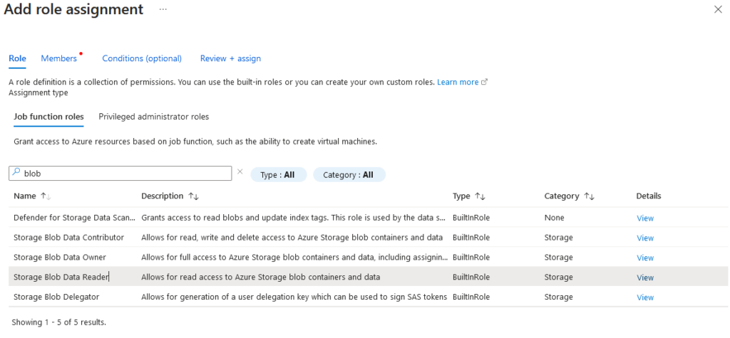 First, select a role to grant access to the resources. In this case, we want to add the Storage Blob Data reader role. To easily find the right group, you can use the search function.