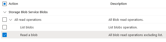 First, we need to add an action. When you select Add action, a list of all the available actions will appear. For the authorization of the blobs, we only need “Read a blob”.
