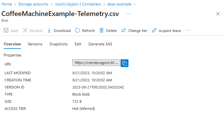Just to be sure, we also open the blob “CoffeeMachineExample-Telemetry.csv” with the project tag “Coffee”. As you can see in the screenshot below, we are allowed to open this file.